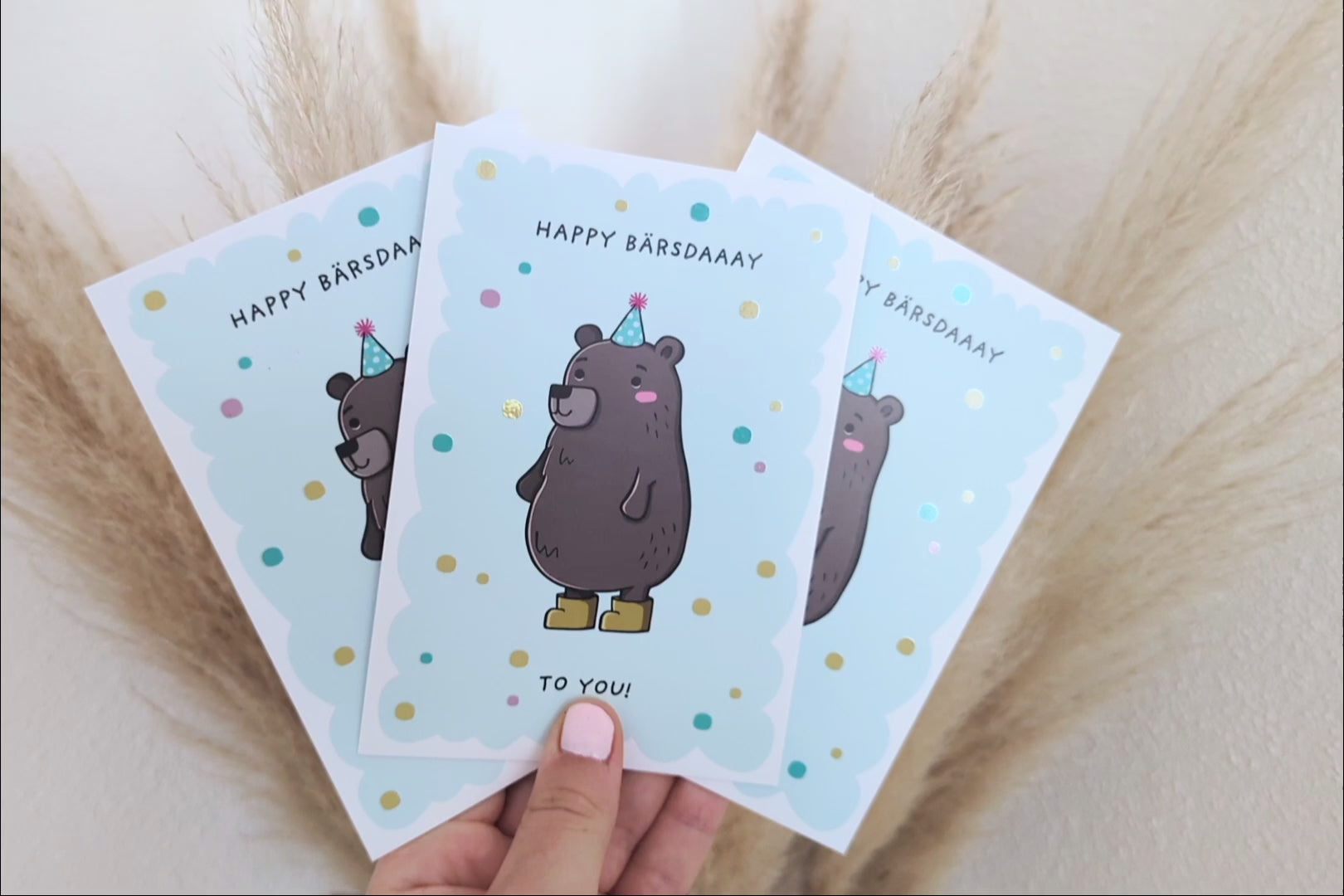 Liebevoll illustrierte Postkarte im Format A6, gedruckt auf hochwertigem Papier mit einer Stärke von 450 g/m². Highlight: Das Konfetti und der Bommel des Geburtstagshutes sind mit partiellem UV-Lack veredelt, sodass diese mit einem schönen Glanz-Effekt hervorgehoben werden.